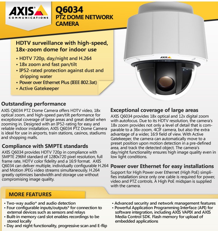 A high-powered dome network camera, the AXIS Q6034 PTZ Dome HD Surveillance Camera provides exceptional coverage of vast indoor areas. With its high-speed pan/tilt and impressive zoom capabilities, this network device produces incredible detail while surveying a wide field of view. It provides 360-degree coverage by way of E-flip. It provides 18x optical and 12x digital zoom with autofocus. Due to its HDTV resolution, the camera's 18x zoom provides not only a level of detail that is comparable to a 36x zoom 4CIF unit, but also the extra advantage of a wider, 16:9 field of view.