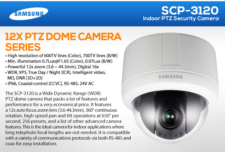 The Samsung SCP-3120 Indoor PTZ Security Camera is a robust surveillance system that has great coverage at a very economical price. The SCP-3120 is built with the IP66-rated casing, tough and weather-resistant, totally protected against the elements; and a 12x auto focus zoom lens (3.6-44.3mm). This makes it the perfect solution for indoor monitoring activities where long focal requirements are not needed. It comes with a 360 degree continuous rotation with high speed pan and tilt functions at a rate of 650 degrees per second, with 256 presets, assuring the camera is always keeping an eye out for you.